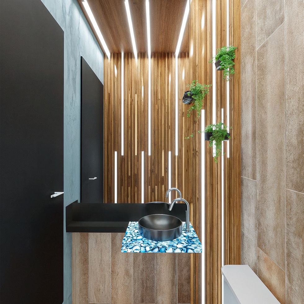 "Este bar já é um convite. Com localização privilegiada e design marcante, o espaço combina materiais naturais, iluminação arquitetônica e texturas envolventes. O teto amadeirado exibe espelhos hexagonais abraçados por iluminação em LED e a bancada revestida em Ágatha Blue cria um cenário exclusivo, pensada para surpreender hóspedes do Beach Ipanema Hostel e público em geral."